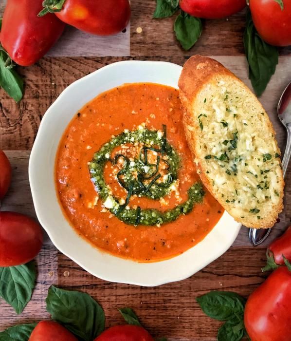 Creamy Tomato Basil Soup with Roasted Garlic