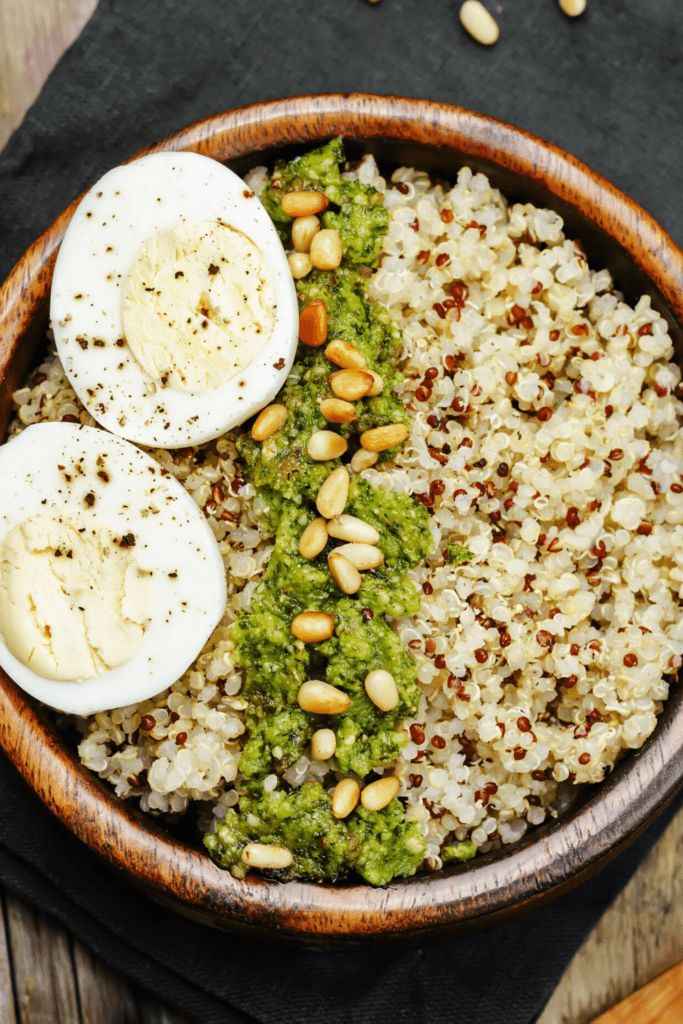 Options include boiled eggs, yogurt, nuts, smoothies, chickpeas, and protein bars.